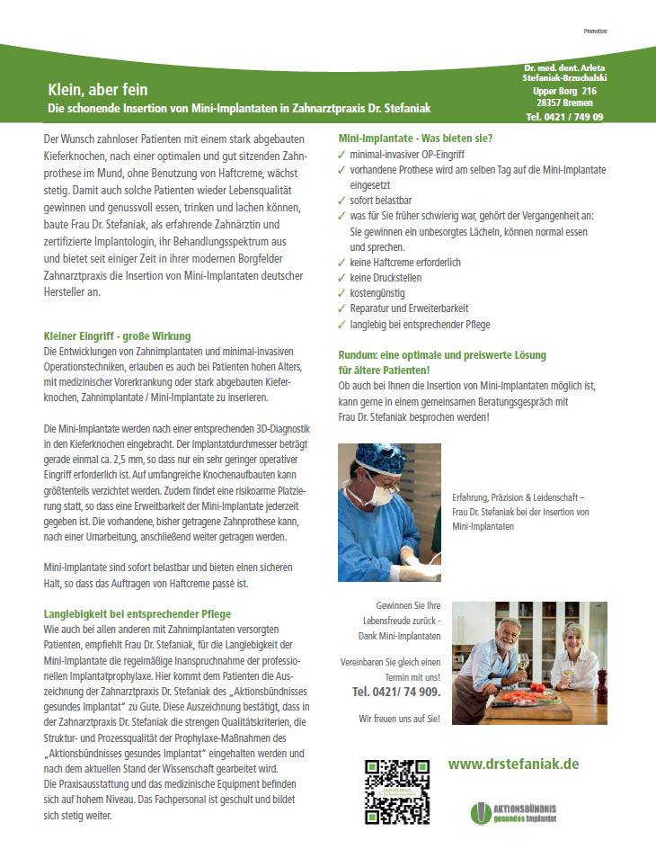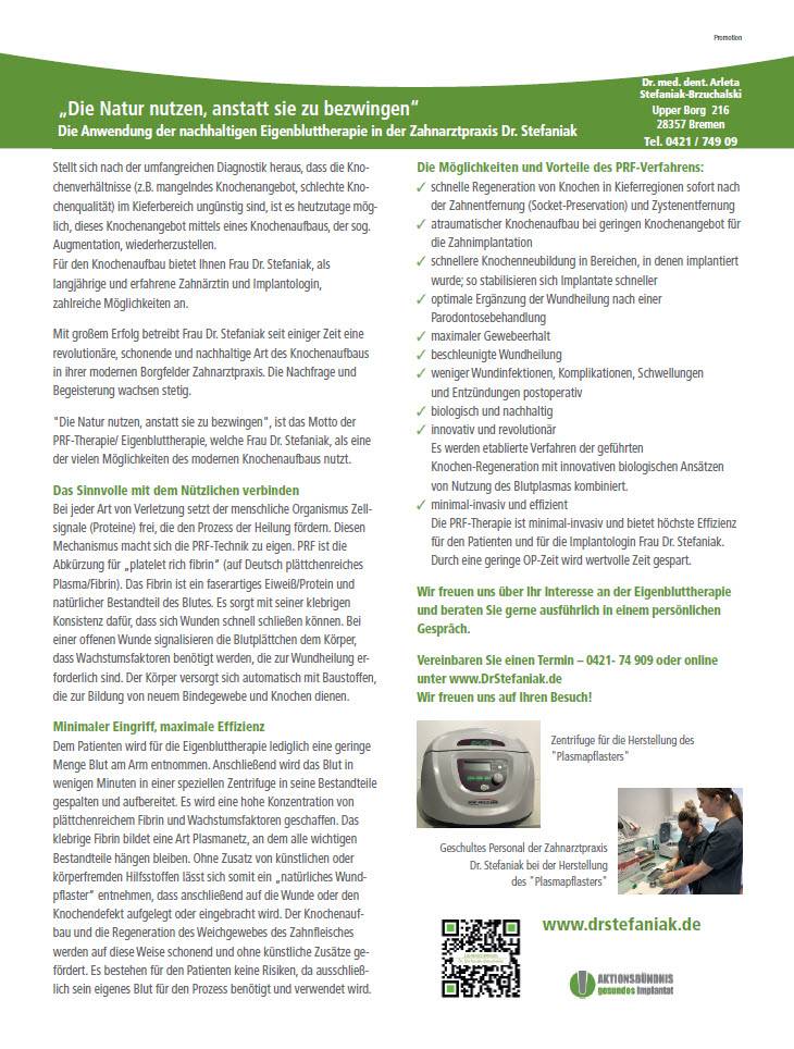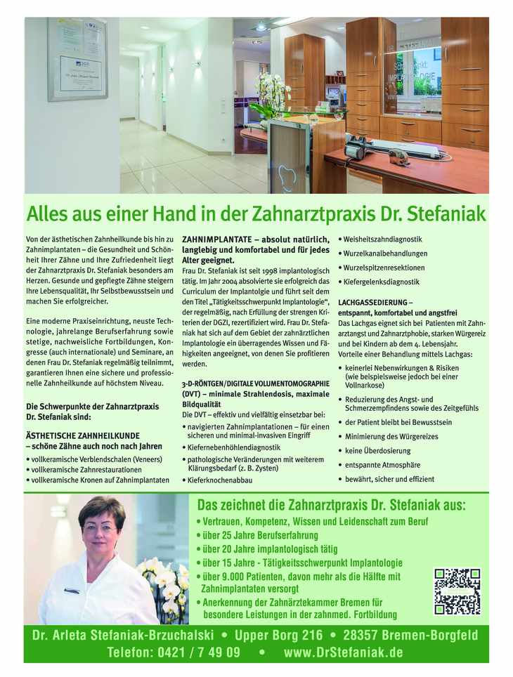 Publikationen Alles aus einer Hand - Die Zahnarztpraxis Dr. Stefaniak Ästhetische Zahnheilkunde - schöne Zähne auch noch nach Jahren mit der Zahnarztpraxis Dr. Stefaniak„Sanftes Licht - starke Wirkung“ effektiv, schonend, schmerzfrei – die Softlasertherapie in der Zahnarztpraxis Dr. StefaniakAch, du Schreck.... Genießen Sie eine komfortable, entspannte und angstfreie Behandlung in der Zahnarztpraxis Dr. Stefaniak„Die Natur nutzen, anstatt sie zu bezwingen“ Die Anwendung der nachhaltigen Eigenbluttherapie in der Zahnarztpraxis Dr. StefaniakKlein, aber fein Die schonende Insertion von Mini-Implantaten in der Zahnarztpraxis Dr. StefaniakDie 3-D-navigierte Zahnimplantation - Präzision und vollste Sicherheit in der Zahnarztpraxis Dr. Stefaniak - Die Professionelle Zahnreinigung - Wellness und Gesunderhaltung der Zähne in der Zahnarztpraxis Dr. Stefaniak -Wichtige Patientenfragen rund um ein Zahnimplantat Die Zahnimplantation aus einer Hand in der Zahnarztpraxis Dr. Stefaniak