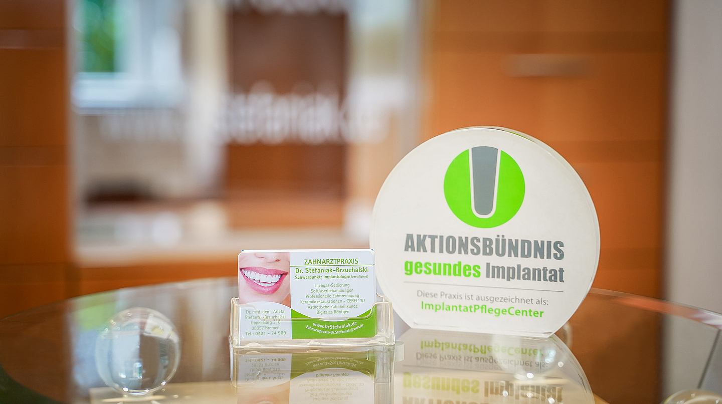 Die Zahnarztpraxis Dr. Stefaniak hat von dem „Aktionsbündnis gesundes Implantat“ eine Auszeichnung verliehen bekommen. Diese Auszeichnung bestätigt, dass bei uns die strengen Qualitätskriterien, die Struktur- und Prozessqualität der Prophylaxe-Maßnahmen des Aktionsbündnisses gesundes Implantat eingehalten werden und nach dem aktuellen Stand der Wissenschaft gearbeitet wird.