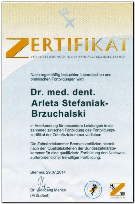 Anerkennung für besondere Leistungen in der zahnmed. Fortbildung- Zertifikat der Zahnärztekammer Bremen |